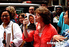 在書店外排隊(duì)等候克林頓簽名的斯維珍尼亞親吻回憶錄封面上的克林頓,表示對(duì)這位前美國總統(tǒng)的喜愛。