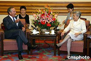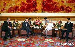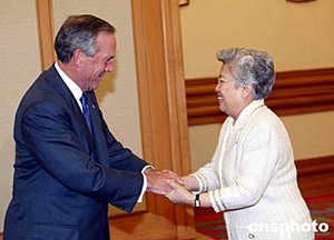 中國(guó)國(guó)務(wù)院副總理吳儀六月二十三日在北京中南海會(huì)見來訪的美國(guó)商務(wù)部長(zhǎng)埃文斯。會(huì)談中,吳儀副總理指著自己穿的衣服和鞋子說,這些都是美國(guó)產(chǎn)品,也算是為縮小中美貿(mào)易逆差做貢獻(xiàn),幽默的語言引來現(xiàn)場(chǎng)一片歡笑。中新社記者:毛建軍