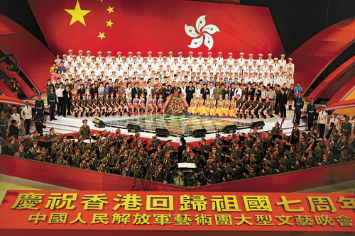 中新網(wǎng)6月24日電 據(jù)香港大公報報道,中國人民解放軍藝術(shù)團(tuán)昨晚在香港紅磡體育館舉行“慶祝香港回歸七周年大型文藝晚會”首場演出。特區(qū)行政長官董建華、中央駐港聯(lián)絡(luò)辦主任高祀仁,副主任李剛,外交部駐港特派員楊文昌、解放軍駐港部隊(duì)司令員王繼堂、政委王玉發(fā),特區(qū)律政司司長梁愛詩等出席觀看了晚會。