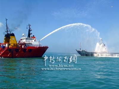 此時(shí),觀摩演習(xí)的人們發(fā)現(xiàn),在出事船只周圍,已經(jīng)有多條各類救助船開始行動(dòng),中國(guó)救助船“南鷹”輪和“南海救一六八”輪一左一右向燃燒著的遇難船只進(jìn)行壓制性滅火。兩只泡沫槍和一只高壓水槍對(duì)準(zhǔn)海難船強(qiáng)制滅火。此時(shí)的場(chǎng)面蔚為壯觀,一只高壓水槍激起的水霧在熱帶陽(yáng)光的照耀下出現(xiàn)了一道漂亮的彩虹。