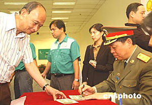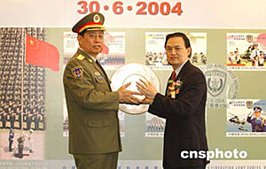 中新網(wǎng)6月30日電 香港郵政今日發(fā)行“中國(guó)人民解放軍駐香港部隊(duì)”特別郵票。發(fā)行儀式今早在香港郵政總局舉行,香港郵政署長(zhǎng)蔣任宏與中國(guó)人民解放軍駐香港部隊(duì)參謀長(zhǎng)王玉仁少將一同在巨型首日封上蓋印,象征郵票正式發(fā)行。