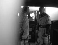 記者前天11時許來到懷柔飛騰影視基地時,天氣十分炎熱,在基地尋找了10多分鐘,后在一個小院旁邊發(fā)現(xiàn)了《紀(jì)曉嵐3》劇組的道具車。順藤摸瓜,記者把相機(jī)放在褲包里悄悄走了進(jìn)去。一間封閉的小房間里傳出了張國立和王剛對臺詞的聲音。但是記者還未移到攝像機(jī)后,立即有工作人員逼問:“你是干什么的?出去出去!”記者說是影迷,只想看看張國立拍戲,工作人員仍然不放行:“不行!你快點(diǎn)出去,別影響我們拍戲!”
