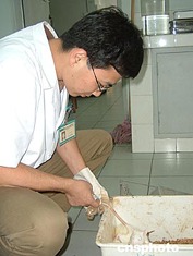 七月七日,武漢同濟(jì)醫(yī)院宣布:該院研究發(fā)現(xiàn)了一種能“激活”胰島素受體下游信號(hào),增加胰島素敏感的基因能治療糠尿病。圖為專家將基因藥物注入實(shí)驗(yàn)大白鼠體內(nèi)。作者:艾啟平