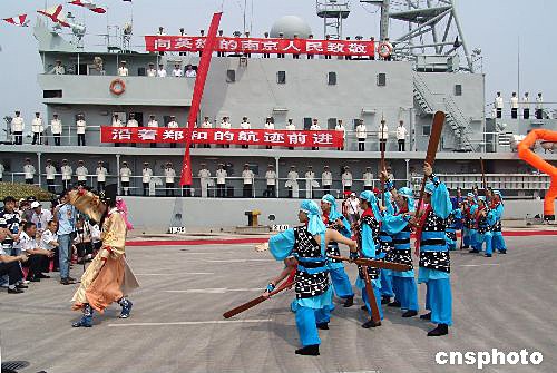 中國海軍建造的第一艘遠洋航海訓練艦“鄭和”號,七月十日抵達南京港龍?zhí)洞a頭,受到各界人士的熱烈歡迎。南京是鄭和下西洋的決策地,也是他長期生活的地方,至今該市仍保存著許多有關鄭和的遺跡。王曉紅 攝