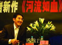 在新聞發(fā)布會(huì)上,對(duì)出版社和記者的提問(wèn),海巖妙語(yǔ)連珠,他告訴在場(chǎng)記者,現(xiàn)在流行起一些莫名其妙,看不太懂的名字,這部小說(shuō)原來(lái)的名字是《自古忠誠(chéng)無(wú)孝子》,出版社說(shuō)不好。改成《河流如血》出版社就同意了。他解釋說(shuō):“我比較喜歡河流。”