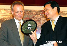 湖南省常務(wù)副省長于幼軍七月十九日會見了美國愛普斯頓公司國際公司董事長麥克·大漠先生一行。麥克表示,愛普斯頓公司已決定在長沙設(shè)立中國中部第一家辦事處,并有意介入湖南的項(xiàng)目開發(fā)。圖為于幼軍將一幅傳統(tǒng)手工藝品湘繡贈與麥克先生。作者:白祖偕
