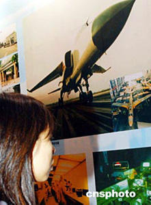 2004西安--香港經(jīng)濟(jì)合作項目推介會,七月二十日在香港會展中心開幕,是次推介會主要以落實中央CEPA安排為契機(jī),充分展示“人文西安--科技西安--現(xiàn)代西安”的新形象與發(fā)展前景。圖為推介會舉辦的圖片展上,介紹由西安飛機(jī)制造公司總裝的全天候超音速轟炸機(jī)“飛豹”。作者:錢興強(qiáng)