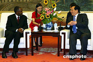 二○○四年七月二十一日,中國國家副主席曾慶紅(右)在北京會見盧旺達外長穆里甘德(左)一行。中新社記者:鄭萍萍