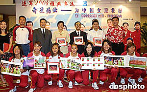 七月二十二日晚,《中國(guó)女足》畫冊(cè)、海報(bào)首發(fā)儀式在上海舉行,此舉也是與中國(guó)女足“牽手”十六年的奇星藥業(yè)為中國(guó)女足出征雅典奧運(yùn)壯行。作者:湯彥俊