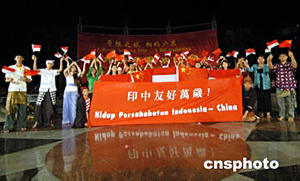 一百多名來自美國、英國、委內(nèi)瑞拉、巴西、馬來西亞、印尼、緬甸等七個國家和香港、澳門特別行政區(qū)的華裔青年,二十五日晚在廣州華南師大與廣州青年歡聚一堂。印尼華裔青年在聯(lián)歡會上表演節(jié)目。作者:羅仰明