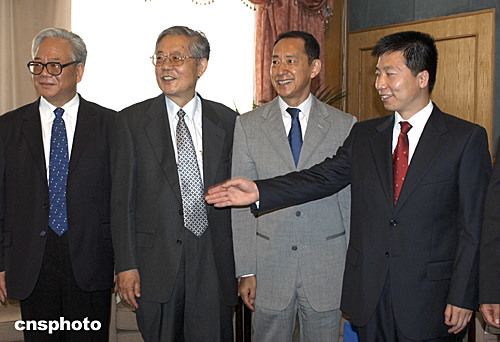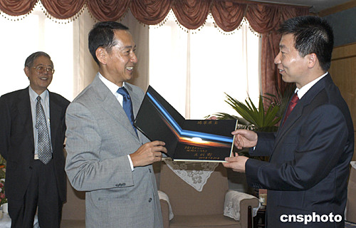 七月三十日,中國首飛航天員楊利偉(右)與日本首飛航天員毛利衛(wèi)(左二),在北京中國科技會堂會面。中國科學技術協(xié)會主席周光召(左一)主持了會見儀式。中新社記者:鄒憲