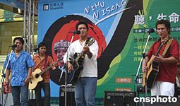 宏利人壽臺灣公司、臺北愛樂電臺等攜手制作出由花蓮縣“太平國小布農(nóng)兒童合唱團(tuán)”演唱的CD。CD義賣所得,將捐給臺癌癥希望協(xié)會。圖為四名原住民成人歌手,為推動CD義賣在街頭落力演唱。中新社記者:董會峰