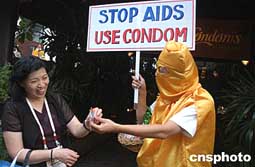 泰國預防艾滋病教育已經(jīng)融入當?shù)厣鐣睿园踩、性健康的觀念開始逐漸成為民眾的自覺意識。座落在曼谷市區(qū)最繁華的蘇孔特威路的曼谷“小白菜安全套餐廳”是泰國人口與社區(qū)發(fā)展協(xié)會主席米猜先生創(chuàng)辦的。每逢節(jié)假日,餐廳門口還會有一名扮成安全套卡通人物的店員,手擎著“預防艾滋病,請用安全套”的標語牌,向每一位就餐者熱情地奉上一個安全套。中新社記者:曾利明