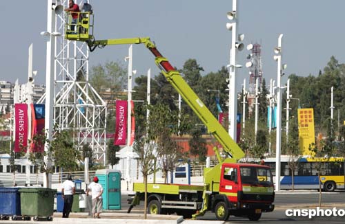 (當(dāng)?shù)貢r(shí)間)二○○四年八月三日,希臘雅典奧運(yùn)會(huì)主體育場(chǎng)外的配套工程緊張進(jìn)行,工人們冒著烈日安裝擴(kuò)音設(shè)施。中新社記者:任晨鳴