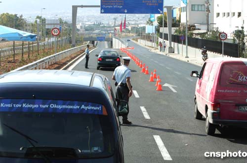 (當(dāng)?shù)貢r(shí)間)二○○四年八月三日,位于希臘雅典市郊的奧運(yùn)村入口由警方嚴(yán)加把守。中新社記者:任晨鳴