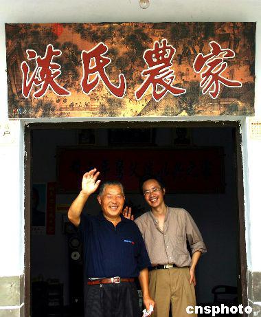 二○○四年八月四日,鄧小平百年誕辰即將到來(lái),現(xiàn)年六十八歲的小平表弟淡文全在小平故鄉(xiāng)廣安牌坊新村經(jīng)營(yíng)著自己的“淡氏農(nóng)家”,言表中洋溢著愉悅。圖為接受采訪后,淡文全與大女婿張遇春送別記者。作者:郭晉嘉