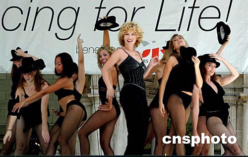 美東時間八月五日中午,紐約市中心布萊恩特公園內(nèi)舉辦《為生命起舞》的義演活動,數(shù)十位百老匯藝員載歌載舞,為艾滋病患者募捐,支持他們在社會生活中繼續(xù)獲得平等權(quán)利。圖為費麗莎·芬利(Felicia Finley)(中)引領(lǐng)舞者,表演《用強勁的音符打動我》。作者:陳建