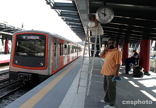 通往雅典奧運(yùn)會(huì)主會(huì)場(chǎng)的輕軌鐵路雖然已經(jīng)通車(chē)多日,但是多項(xiàng)收尾工程至今未完成。當(dāng)?shù)貢r(shí)間8月7日清晨,希臘工人依照傳統(tǒng)習(xí)俗不緊不慢地在站臺(tái)調(diào)試一直沒(méi)有運(yùn)行的時(shí)鐘。中新社記者:任晨鳴