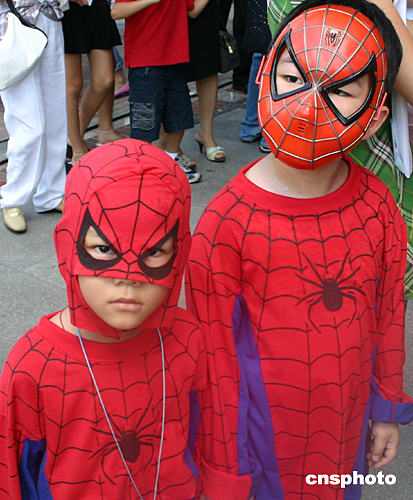 為慶祝臺(tái)北偶戲館開(kāi)張,八月七日臺(tái)北街頭舉行了戲偶隊(duì)伍游行。圖為兩名打扮成電影“蜘蛛俠”造型的小朋友。作者:董會(huì)峰
