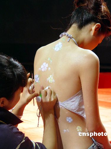 2004年8月7日,南京市某商家在其新產品推介會上,再次請來模特現(xiàn)場彩繪秀,以吸引消費者眼球。作者:王耀武