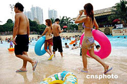 連日來(lái)深圳市持續(xù)高溫天氣,但深圳的旅游景區(qū)依然火爆,處處呈現(xiàn)游客火熱的身影。圖為歡樂(lè)谷瑪雅海灘成為游客防暑降溫的好去處。作者:陳文