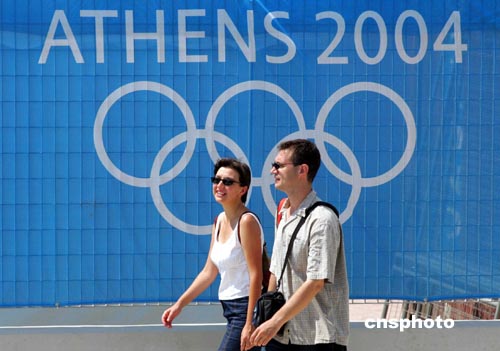2004雅典奧運(yùn)會(huì)開(kāi)幕在即,雅典街頭的“奧運(yùn)味道”也越來(lái)越濃。圖為一對(duì)青年男女經(jīng)過(guò)雅典奧運(yùn)標(biāo)志牌。中新社記者:張煒