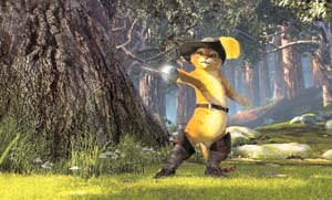 5.貓咪殺手鉆進(jìn)史瑞克的衣服,然后從衣服中鉆出的鏡頭模仿了《異形》系列。在那套恐怖片中,樣子惡心的異形總是從人類宿主的體內(nèi)血淋淋地鉆出來,恐怖至極。本片卻化血腥為幽默。