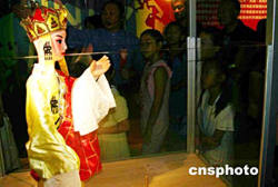 耗資二億元新臺(tái)幣建成的臺(tái)灣省臺(tái)北市偶戲館八月上旬開(kāi)張。圖為一尊唐僧木偶,吸引不少觀眾駐足。作者:董會(huì)峰