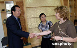 八月十一日,國務(wù)院僑辦副主任許又聲(左)在北京華文學(xué)院會見了塞爾維亞和黑山貝塔通訊社社長柳比察·馬爾科維奇。中新社記者:史利