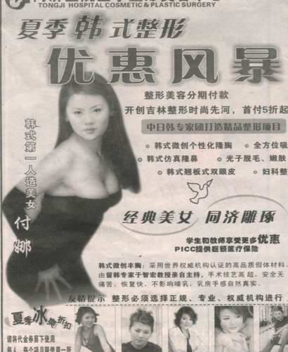 中新網(wǎng)8月12日電 據(jù)生活日報報道,在電影《手機》里游刃有余地同時飾演呂桂花、牛彩云兩個性格迥異角色的青年演員楊欣,因長相酷似鞏俐而被稱作“小鞏俐”,天生一副90、60、90三圍的火辣魔鬼身材。楊欣做夢也想不到,吉林省長春市某醫(yī)院醫(yī)學(xué)整形美容中心,鬼斧神工般地給她的代表性照片實施了“換頭術(shù)”,用楊欣的火辣身材和該中心“韓式第一人造美女”付某的頭臉,在當(dāng)?shù)匕l(fā)行量相當(dāng)大的一份報紙上做起了廣告。