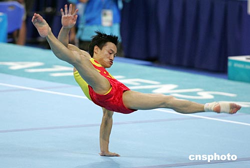 中國男子體操隊于當?shù)貢r間八月十一日晚在雅典奧運體操比賽館與德國、日本、烏克蘭隊進行集體合練,圖為楊威在自由體操訓(xùn)練中。中新社記者:毛建軍