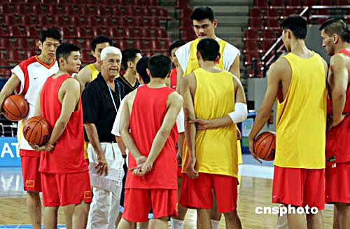 當(dāng)滿頭銀發(fā)的中國(guó)男籃主帥哈里斯姍姍出現(xiàn)在訓(xùn)練館內(nèi)時(shí),隊(duì)員們開(kāi)始集合,此時(shí)比預(yù)定的訓(xùn)練時(shí)間晚了半個(gè)多小時(shí)。在例行的熱身活動(dòng)后,中國(guó)男籃分成黃、紅兩隊(duì)進(jìn)行了幾套戰(zhàn)術(shù)的演練。由姚明、易建聯(lián)、李楠、劉煒、朱芳雨等組成的黃隊(duì)無(wú)疑是中國(guó)男籃的主力陣容。