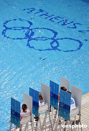 雅典奧運跳水比賽館當(dāng)?shù)貢r間八月十二日試驗電子打分系統(tǒng),裁判當(dāng)場打分時將用擋板隔開進(jìn)行獨立操作。中新社記者:毛建軍