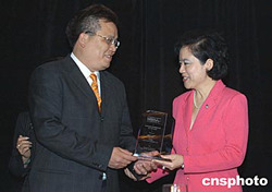 美東時(shí)間八月十二日,由美國(guó)聯(lián)邦政府舉辦的紐約區(qū)二○○四年少數(shù)族裔企業(yè)發(fā)展周活動(dòng)在紐約開(kāi)幕。美國(guó)商務(wù)部少數(shù)族裔商業(yè)發(fā)展署副署長(zhǎng)董繼玲(右)向《星島日?qǐng)?bào)》紐約公司執(zhí)行總監(jiān)梅建國(guó)(左)頒發(fā)獎(jiǎng)杯,表彰《星島日?qǐng)?bào)》成為本年度美國(guó)少數(shù)族裔的最佳企業(yè)。作者:陳建