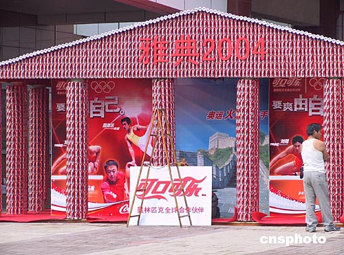 當運動健兒和各家媒體都在為奧運會做最后的準備時,許多商家也瞄準了雅典奧運巨大的商機。八月十三日在北京西單,一家公司正打著雅典奧運的旗號為自己的商品做促銷準備。作者:任振興