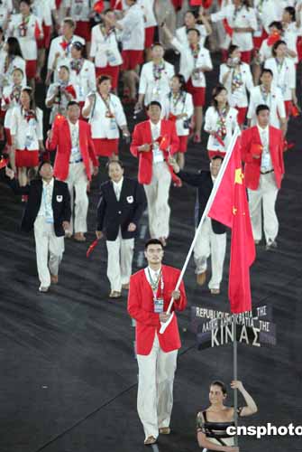 當?shù)貢r間八月十三日晚,第二十八屆奧運會在希臘雅典開幕。圖為中國體育代表團以龐大陣容進入會場。中新社記者:毛建軍