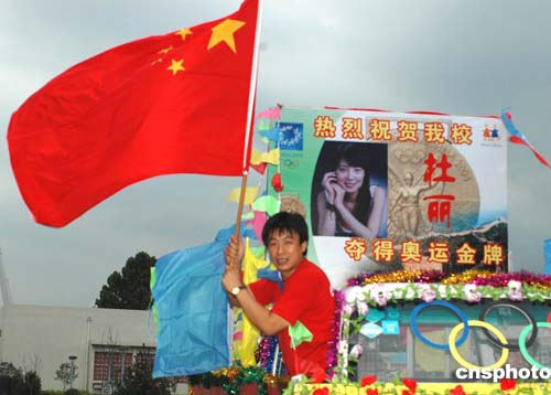 在八月十四日下午結(jié)束的雅典奧運會女子十米氣步槍決賽中,山東女射擊運動員杜麗奪得本屆奧運會首枚金牌。杜麗的母校山東省競技體育運動學校的師生扎制彩車在濟南街頭游行慶祝。作者:宋衛(wèi)東