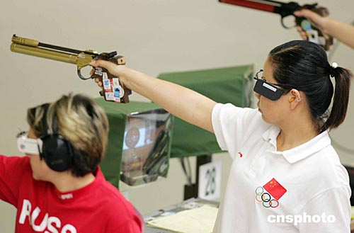 曾奪取奧運(yùn)冠軍,并使用特制金槍的陶璐娜是中國(guó)射擊隊(duì)的風(fēng)云人物,今天的預(yù)賽吸引很多觀眾前來(lái)觀看。不過(guò),她“手風(fēng)”非常不順,在第一個(gè)十發(fā)打出了九十四環(huán)的成績(jī)。