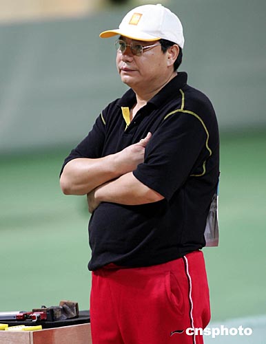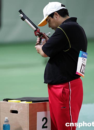 當?shù)貢r間八月十四日下午雅典奧運會男子十米氣手槍比賽中,四十四歲的中國“老槍”王義夫一直落后于一名俄羅斯選手,在擊發(fā)最后一顆子彈時,他冷靜沉思片刻后一槍將金牌“擊落”。中新社記者:任晨鳴