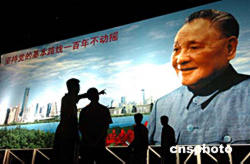 八月十五日晚,巨幅小平新畫像高高懸掛,新畫像偉人背后的背景是深圳新市容,展現(xiàn)特區(qū)深圳的新變化。在鄧小平誕辰百年之際,深圳市民更加懷念敬愛的小平。作者:陳文