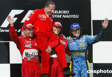 中新網(wǎng)8月16日電 今年的匈牙利大獎(jiǎng)賽再一次成為了法拉利車隊(duì)的表演賽。大舒馬赫和巴里切羅包攬了前二名。大舒馬赫以1小時(shí)35分26秒131的成績,取得他今年第12個(gè)分站冠軍并幫助車隊(duì)提前5站取得年度冠軍。