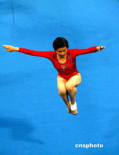 中國女子體操隊主力張楠在15日舉行的的雅典奧運會女子體操團體賽預賽中。中新社記者:王瑤