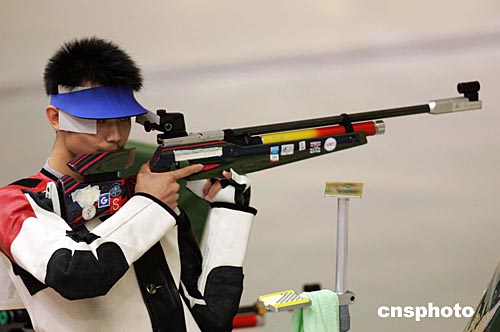 當?shù)貢r間八月十六日,中國選手朱啟南(左)與李杰在雅典奧運男子十米氣步槍射擊比賽中分獲金、銀牌。朱啟南并以七百零二環(huán)的成績打破世界紀錄。中新社記者:毛建軍