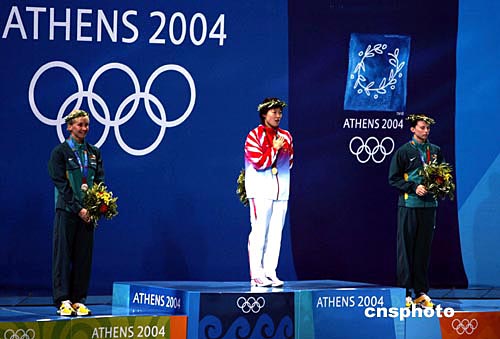參加雅典奧運(yùn)會(huì)游泳比賽的中國(guó)選手極少擁有問(wèn)鼎獎(jiǎng)牌實(shí)力者,羅雪娟在當(dāng)?shù)貢r(shí)間八月十六日晚奇跡般奪得女子一百米蛙泳金牌。這是她登上領(lǐng)獎(jiǎng)臺(tái)最高層,頭戴橄欖桂冠,面對(duì)冉冉升起的中國(guó)國(guó)旗激動(dòng)得和唱著國(guó)歌。中新社記者:任晨鳴