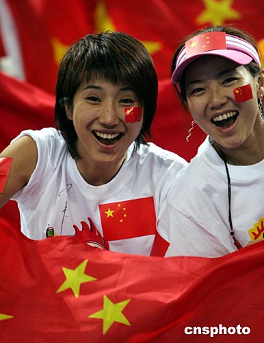當(dāng)?shù)貢r間8月17日,中國男籃在以雅典奧運會小組賽第二場比賽中以69比62艱難戰(zhàn)勝新西蘭隊,兩名來自北京的女球迷到場高喊:“我愛你,中國男籃!”。作者:任晨鳴