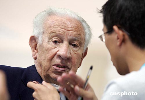 當(dāng)?shù)貢r間八月十七日,國際奧委會前主席薩馬蘭奇在雅典奧運射擊賽場觀看男子五十米手槍慢射比賽。中新社記者:毛建軍