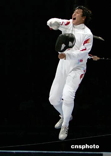 當(dāng)?shù)貢r(shí)間8月17日晚,中國劍客王磊在雅典奧運(yùn)會(huì)男子重劍半決賽中擊敗俄羅斯選手獲得決賽權(quán)。中新社記者:任晨鳴