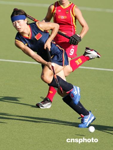 連續(xù)兩場比賽的獲勝讓女曲隊(duì)員和教練金昶伯信心十足。今天的比賽中,她們從一開場就積極進(jìn)攻,與實(shí)力強(qiáng)勁的西班牙隊(duì)展開節(jié)奏很快的對(duì)攻戰(zhàn)。第十四分鐘,十一號(hào)唐春鈴接到隊(duì)友的直線傳球突然轉(zhuǎn)身打門成功,中國隊(duì)取得領(lǐng)先。此后西班牙隊(duì)雖然發(fā)動(dòng)更為猛烈的反擊,但中國隊(duì)的嚴(yán)防屢屢銼其銳氣。上半場比賽快要結(jié)束時(shí),中國隊(duì)通過一次短角球的配合,由付寶榮門前巧妙的墊射將球打進(jìn),以二比0領(lǐng)先結(jié)束上半場比賽。