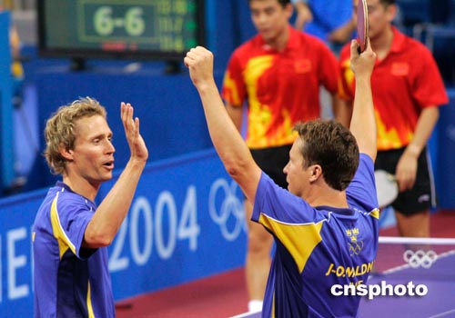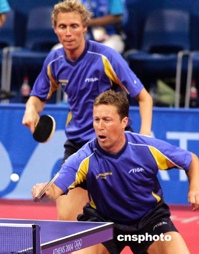 當(dāng)?shù)貢r(shí)間八月十八日舉行的雅典奧運(yùn)會(huì)乒乓球男雙比賽中,中國(guó)選手孔令輝、王皓不敵瑞典老將佩爾森、瓦爾德內(nèi)爾,無(wú)緣晉級(jí)八強(qiáng)。中新社記者:張煒
