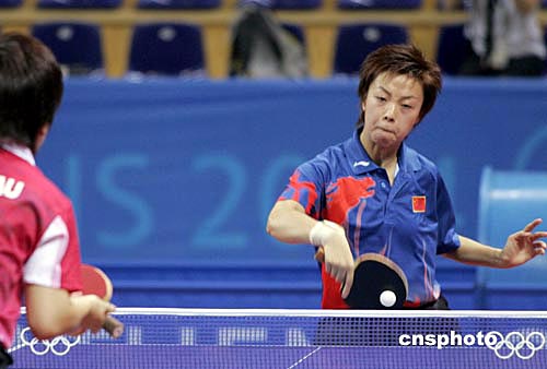 在雅典時間18日晚進行的奧運乒乓女單比賽中,中國選手張怡寧以四比一戰(zhàn)勝中國香港選手柳絮飛,晉級八強。中新社記者:張煒